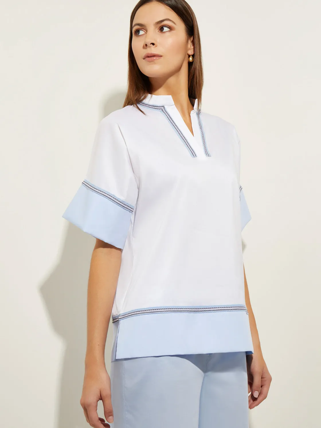 Refresh casual attire with the sharp yet delicate details of this polished stretch cotton blouse. This airy top boasts an effortless look, flawlessly crafted with subtle trim and bold contrasting hem working harmoniously to elevate the design.