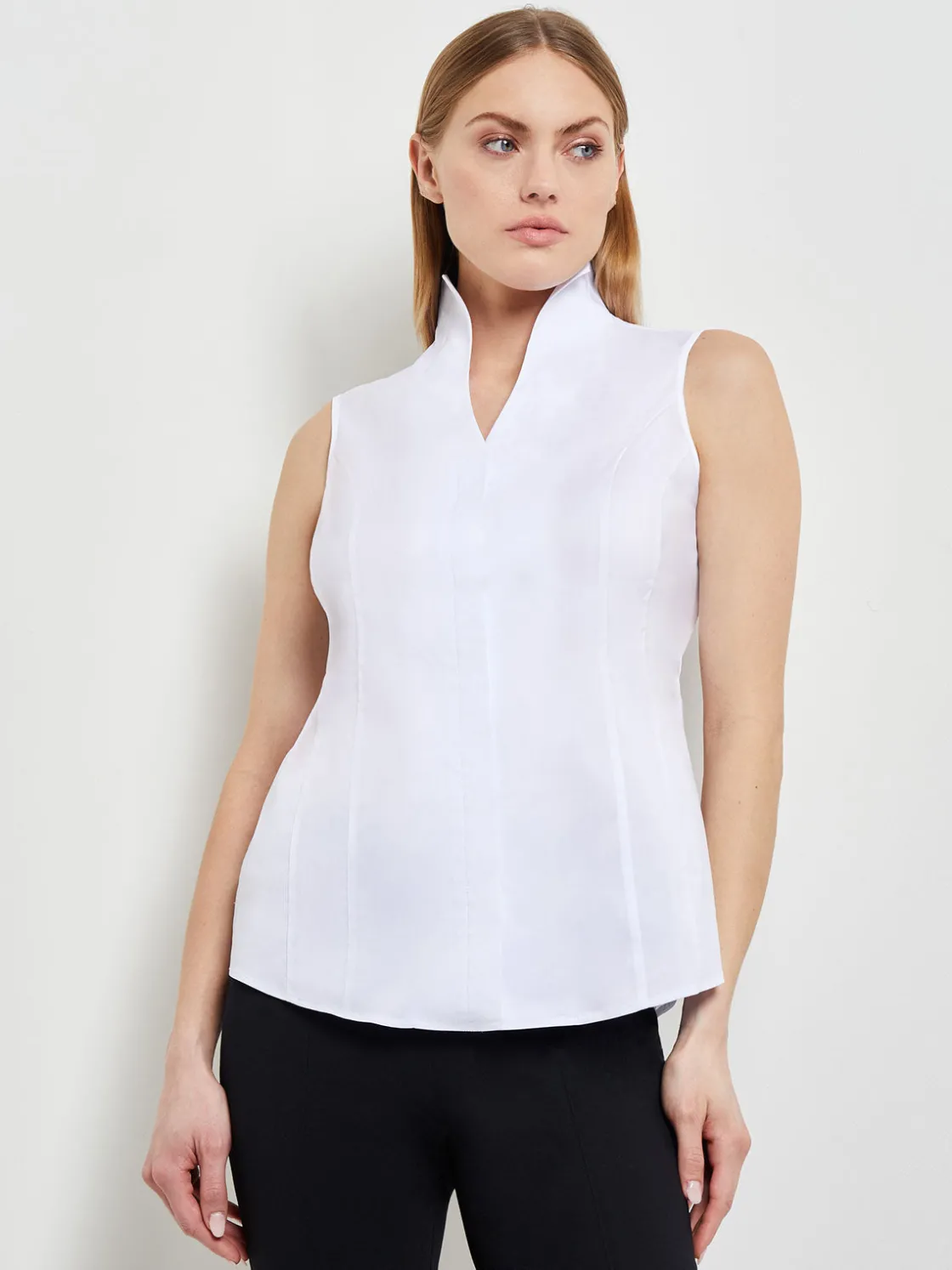 A seasonless and brilliantly cut sleeveless white button-down blouse is the perfect base for outfits all year round. The shirt’s mandarin collar exudes modern elegance, while stretch-cotton and seamed panels simultaneously ensure maximum comfort and impeccable fit. Please size down for a more accurate fit if you are in between sizes.