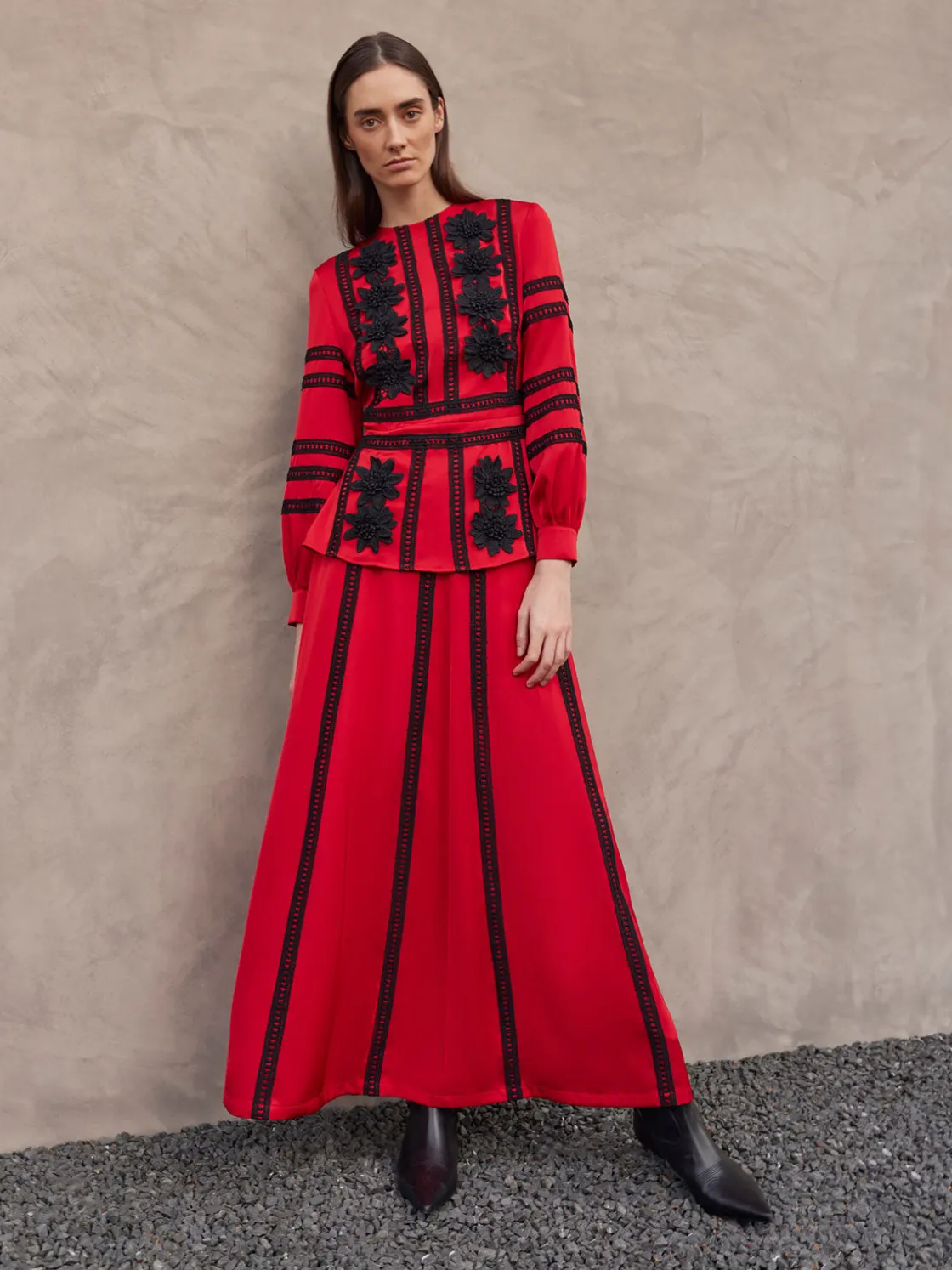 Our A-Line Lace Applique Maxi Skirt is crafted with a luxurious Crepe De Chine. The lace appliques are handsewn onto the garment, making every piece special. Pair this skirt with the matching blouse for a complete ensemble.