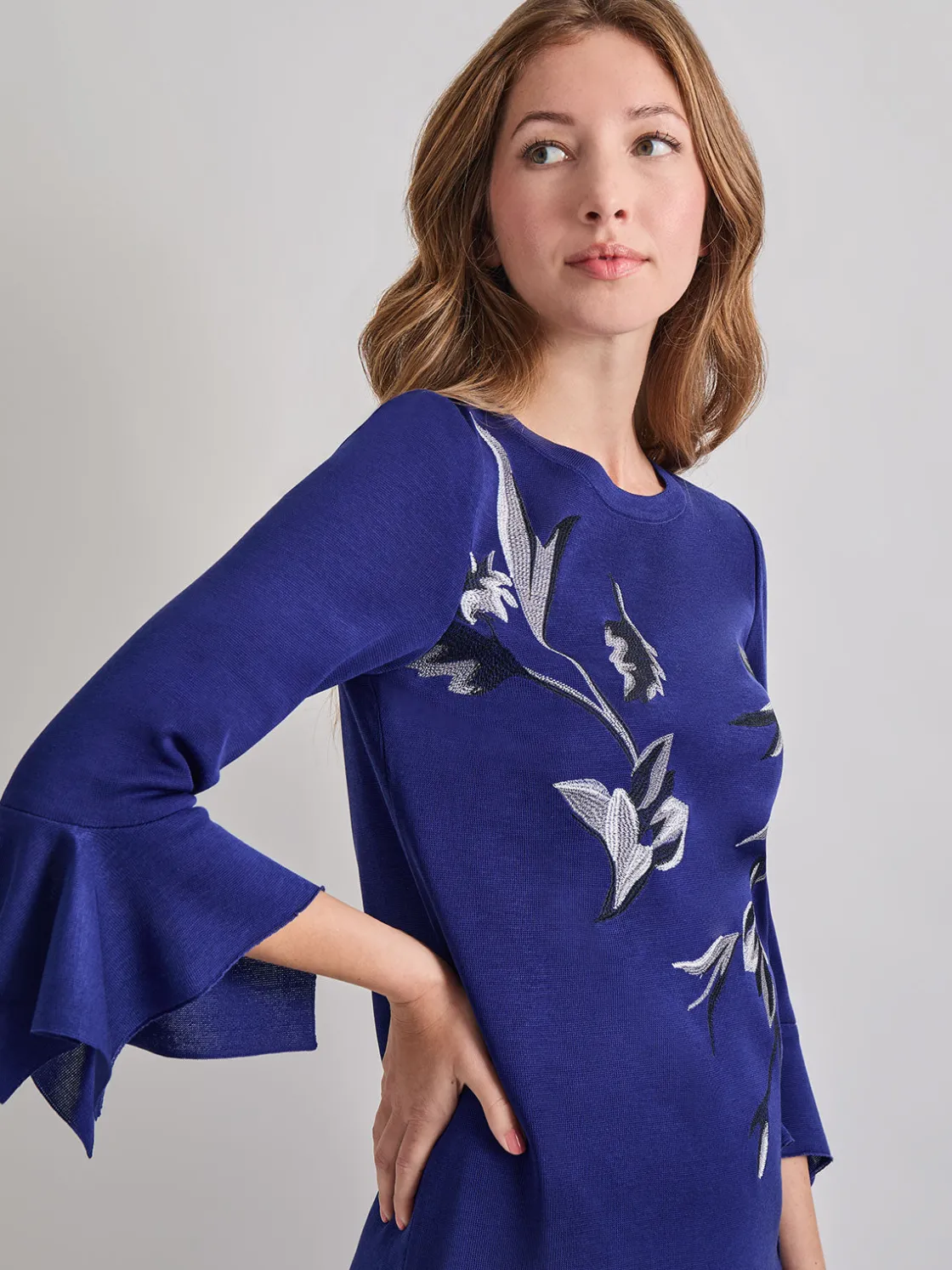Our Embroidered Floral Knit Blouse features handkerchief sleeves and a detailed floral embroidery down the front of the garment. Easily pair this tunic with our vegan leather accordian skirt for a tonal look or a pair of our iconic black knit pants for a more casual encounter.