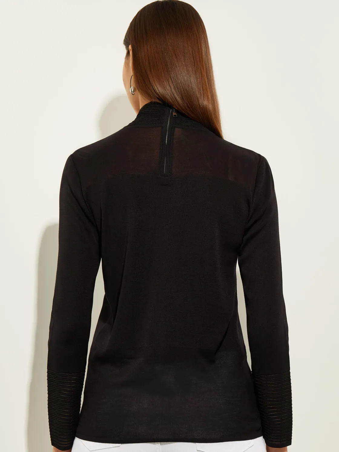 Slightly sheer yet tastefully modest, our Sheer Inset Turtleneck looks great with slim-fit pants and heels — with or without your favorite MISOOK jacket. Details like the zipper at the back of the neck and ribbed accents on the neck and sleeves reflect a trend-forward attitude, and the machine-washable fabric makes it a practical addition to your wardrobe.