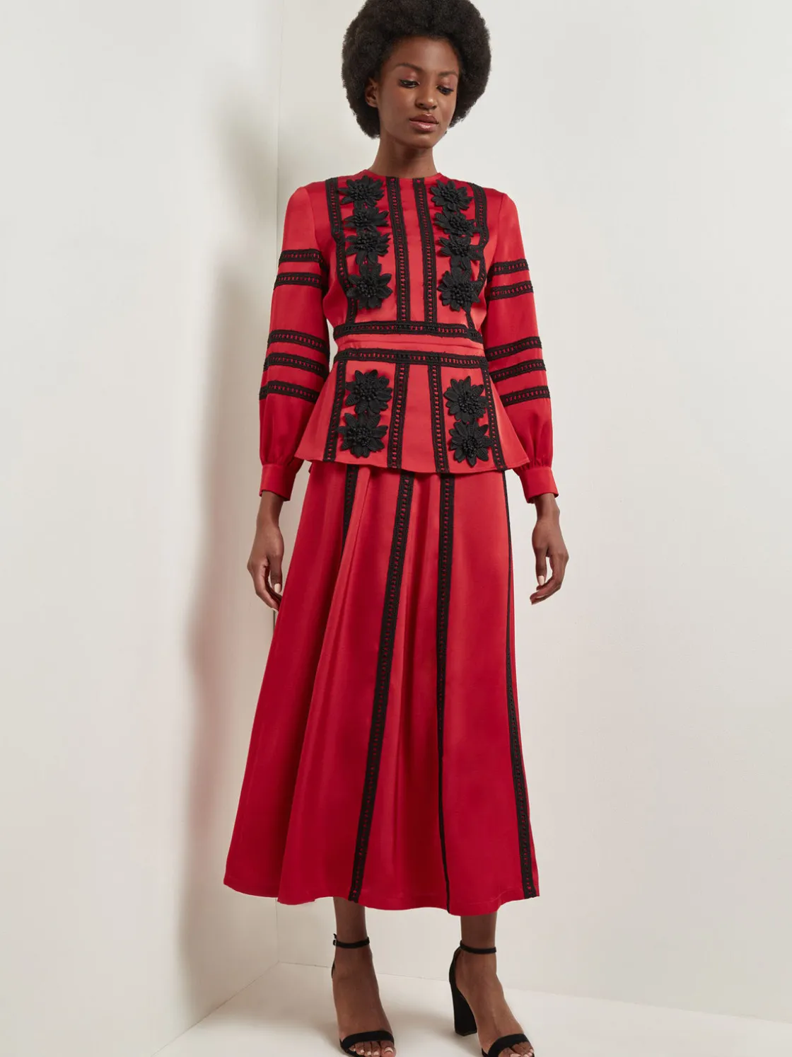 Our Floral Lace Peplum Blouse features a hand-sewn lace applique throughout the garment. The cuffed long sleeves and peplum feature give this blouse subtle volume. Pair this blouse with our matching skirt to pull the whole look together.
