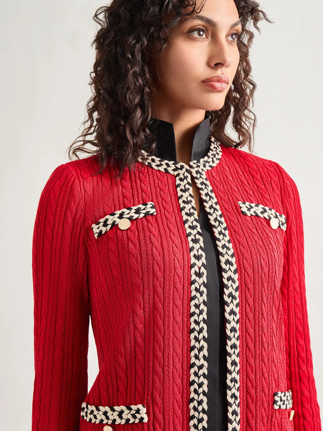 Traditional meets modern in the fascinating design of our Jewel Neck Contrast Trim Cable Knit Jacket. The classic tweed knit is enhanced with a rich color combination with braided trim along the collar, an open front, and pockets – both faux and functional. This sleek jacket flatters with a timeless heritage fit that offers a polished, tailored look. Pair it with matching tweed bottoms or sharp suiting separates for work or formal affairs.